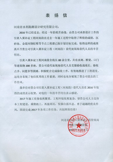 近日,公司收到引黃入冀補(bǔ)淀工程管理局河南工程建設(shè)部發(fā)來的熱情洋溢的表揚(yáng)信,對公司為引黃入冀補(bǔ)淀工程2016年度建設(shè)工作的支持和配合表示衷心的感謝,對公司派駐現(xiàn)場設(shè)代2016年度的技術(shù)服務(wù)工作給予肯定,對設(shè)代人員頂風(fēng)冒雪、放棄假日奮戰(zhàn)在工程建設(shè)第一線的辛勤付出充分認(rèn)可,對豫水設(shè)計(jì)人的工作素質(zhì)和敬業(yè)精神提出了表揚(yáng),并希望設(shè)代人員在2017年的設(shè)代工作中再接再勵、續(xù)寫輝煌。