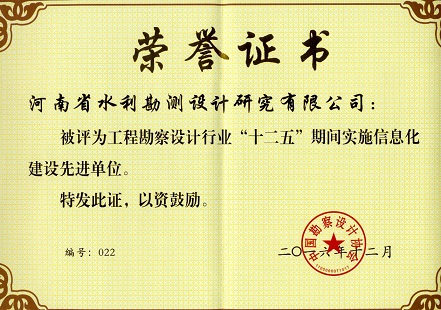 “十二五”期間,我公司以信息化為企業(yè)發(fā)展的重要原動(dòng)力,先后在綜合信息平臺(tái)建設(shè)、三維協(xié)同設(shè)計(jì)平臺(tái)建設(shè)、水利信息化業(yè)務(wù)拓展等方面取得了長(zhǎng)足的發(fā)展,公司管理水平、規(guī)劃設(shè)計(jì)產(chǎn)品質(zhì)量、公司業(yè)務(wù)拓展等實(shí)現(xiàn)了跨越式發(fā)展,得到了業(yè)內(nèi)的認(rèn)可,被中國(guó)勘察設(shè)計(jì)協(xié)會(huì)評(píng)為工程勘察設(shè)計(jì)行業(yè)“十二五”期間實(shí)施信息化建設(shè)“先進(jìn)單位”!數(shù)字工程中心主任高英獲得 “先進(jìn)個(gè)人”榮譽(yù)稱號(hào)!