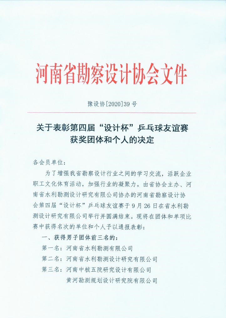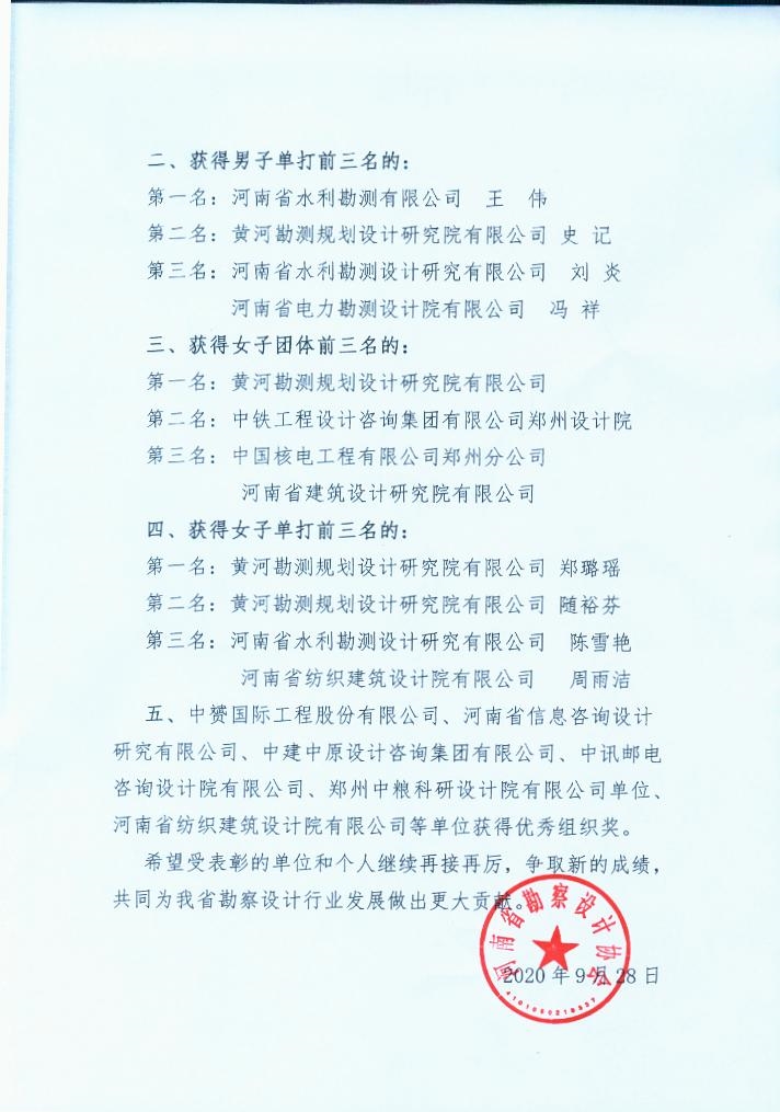 秋高氣爽,金桂飄香,為加強(qiáng)我省勘察設(shè)計(jì)行業(yè)職工的學(xué)習(xí)交流,活躍職工業(yè)余文化生活,增強(qiáng)行業(yè)的凝聚力,在雙節(jié)來臨之際,由河南省勘察設(shè)計(jì)協(xié)會(huì)主辦、我公司協(xié)辦的河南省勘察設(shè)計(jì)協(xié)會(huì)第四屆“設(shè)計(jì)杯”乒乓球友誼賽于2020年9月26日在我公司成功舉辦。