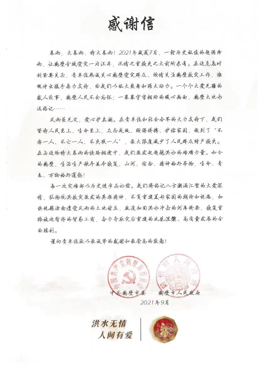 近日,中共鶴壁市委、市政府發(fā)來(lái)感謝信,對(duì)豫水設(shè)計(jì)公司在抗洪搶險(xiǎn)關(guān)鍵時(shí)刻給予幫助表示由衷的感謝。