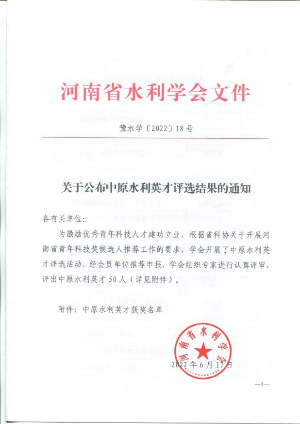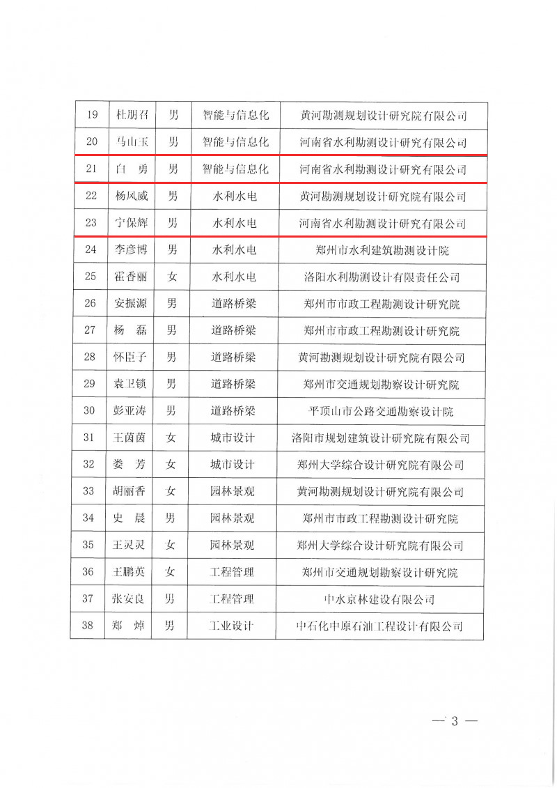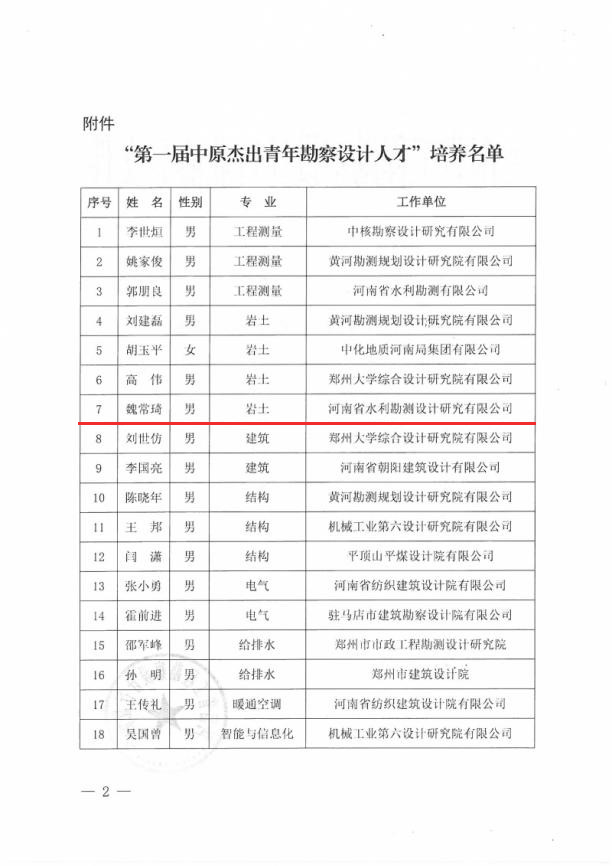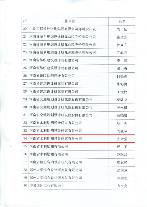 安增強、耿昕、劉曉琴同志獲得河南省勘察設計協會給予的“河南省優秀青年勘察設計師”表彰;寧保輝、馬山玉、白勇、魏常琦同志被河南省工程勘察設計行業協會列入“第一屆中原杰出青年勘察設計人才”培養名單;劉蘭勤、侯曉輝同志被河南省水利學會評為“中原水利英才”。