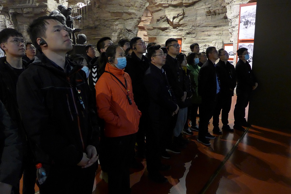 在青年洞,大家沿著“創業路”拾級而上,追憶著半個多世紀前先輩們在此奮斗的足跡:在紅旗渠修建過程中,300名青年組成突擊隊,經過1年5個月的奮戰,將地勢險要、石質堅硬的巖壁鑿通,這個輸水隧洞被命名為青年洞。青年洞現場,面對鮮艷的五星紅旗,全體黨員舉起右拳,在支部書記楊華軍的帶領下,重溫入黨誓詞,堅定了我們緊跟總書記的步伐,奮進新征程的信念和決心。