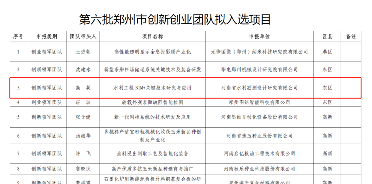近日,根據(jù)鄭州市科技局“第六批鄭州市創(chuàng)新創(chuàng)業(yè)團隊項目擬入選項目公示”,我公司副總經(jīng)理高英帶領團隊開展的“水利工程BIM+關鍵技術研究與應用”入選2023年第六批鄭州市“創(chuàng)新領軍團隊項目”。