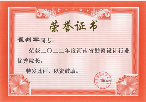 近日,河南省勘察設(shè)計協(xié)會發(fā)布《關(guān)于表彰2022年度河南省工程勘察設(shè)計行業(yè)先進企業(yè)、優(yōu)秀院長的決定》,公司榮獲“2022年度河南省勘察設(shè)計行業(yè)先進企業(yè)”稱號,公司董事長翟淵軍同志被評為“2022年度河南省勘察設(shè)計行業(yè)優(yōu)秀院長”。