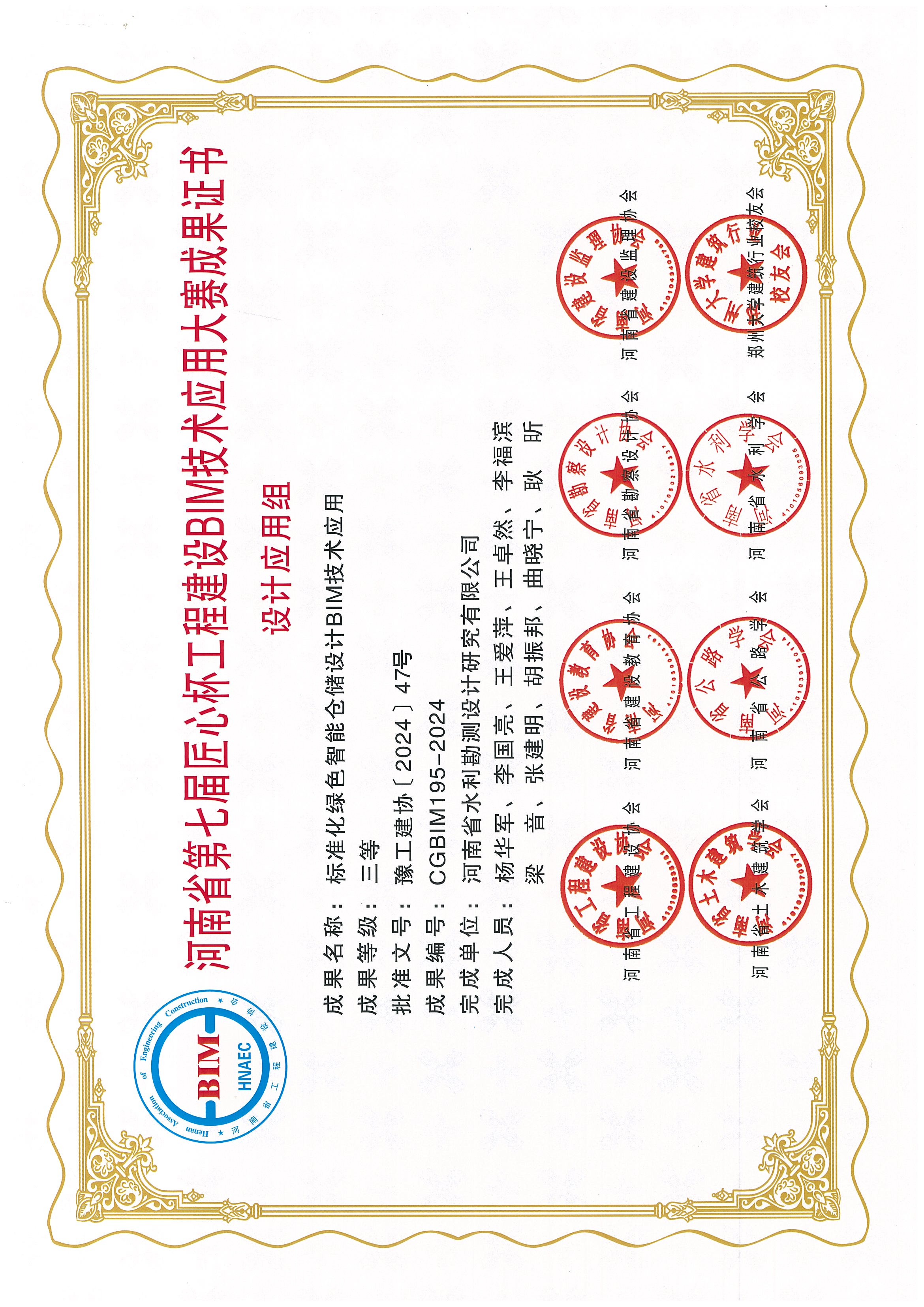 3.《河南省蟒河口水庫左岸防滲工程中的BIM應用》《BIM+和GIS在南水北調中線工程水土保持設計中的應用》《標準化綠色智能倉儲設計BIM技術應用》獲得三等獎。