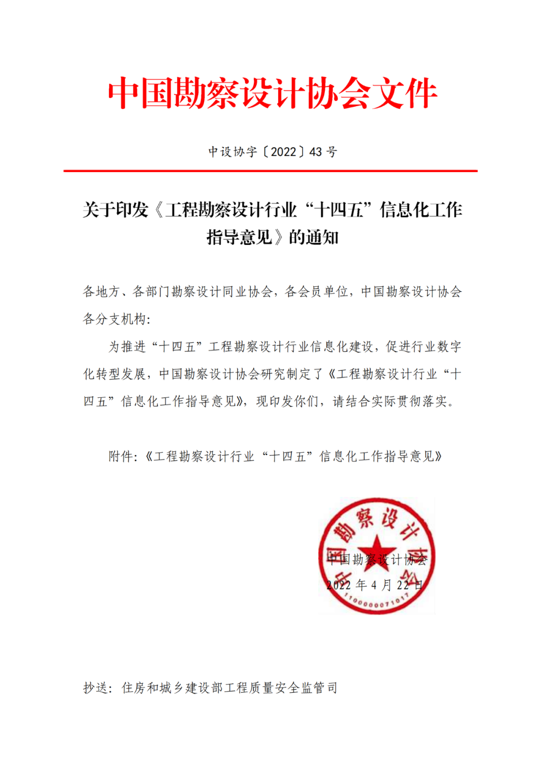 為推進(jìn)“十四五”工程勘察設(shè)計行業(yè)信息化建設(shè),促進(jìn)行業(yè)數(shù)字化轉(zhuǎn)型發(fā)展,中國勘察設(shè)計協(xié)會研究制定了《工程勘察設(shè)計行業(yè)“十四五”信息化工作指導(dǎo)意見》,并印發(fā)通知予以發(fā)布。